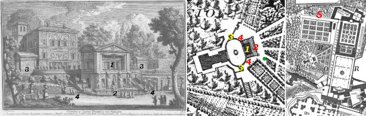 The image taken from the dome of S. Pietro and Vasi's plate highlight a feature of the casino: it was immersed in a natural context, but at the same time it was separated from it; the oval courtyard was limited by a wall which, while not completely precluding the view of the wood surrounding the casino, marked a sort of border between the work of Nature and that of Man.
