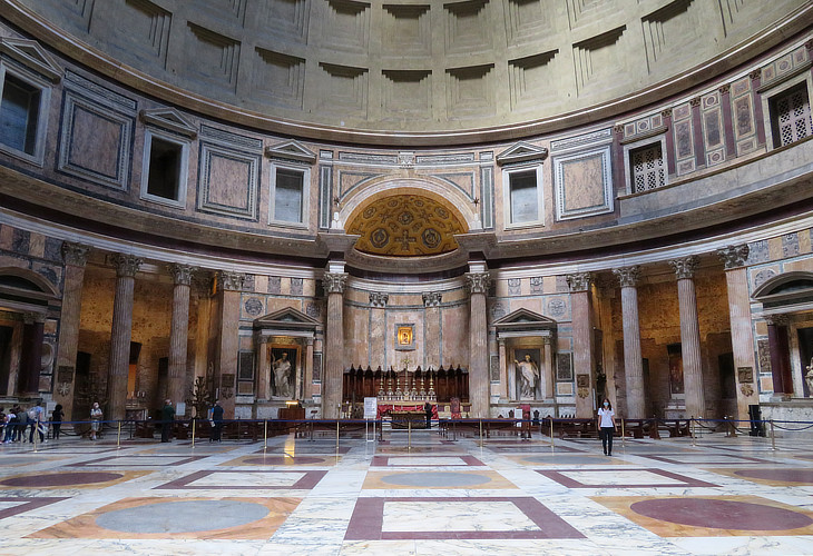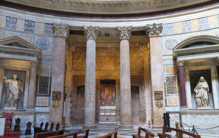 Columns screen off deep recesses from the main circular space, an architectural scheme which was copied in other large Roman buildings, e.g. at Baalbek and by Renaissance and Baroque architects, e.g. by Bernini at S. Andrea al Quirinale.