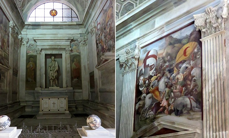 (left) Chapel designed by Antonio da Sangallo the Younger; (right) Battle of Clavijo by Pellegrino da Modena. This legendary battle was fought in 824 in northern Spain. The Christian army defeated that of the Emir of Cordoba with the help of St. James the Apostle who personally acted as commander