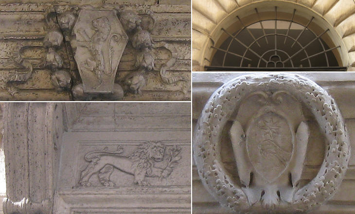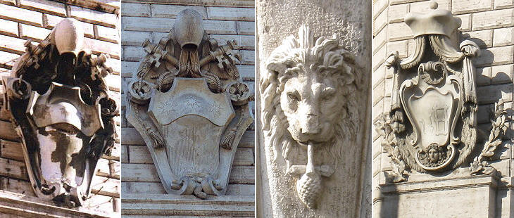 (left to right) Coat of arms of Pope Pius VI before and after being restored; heraldic symbol of the Onesti family; coat of arms of Luigi Onesti Braschi, Duke of Nemi, and Costanza Falconieri, his wife in the Piazza Navona side of the palace
