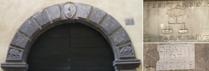 In some cases the reference to the owner of the house is not immediately evident; a fan window above the door of a small building is protected by iron bars starting from a point decorated with three mountains: it means it belonged to the Peretti, the family of Pope Sixtus V, whose heraldic symbols included the trimonzio, three mountains.