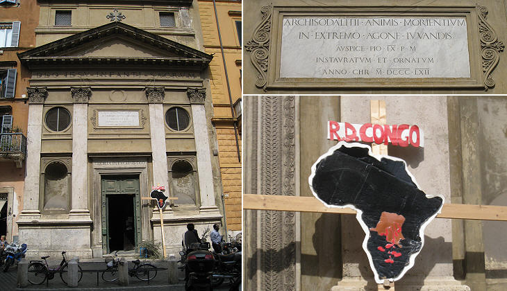 (left) Façade of S. Maria degli Agonizzanti; (right-above) inscription celebrating 1862 modifications; (right-below) map of the Democratic Republic of the Congo on a crucifix