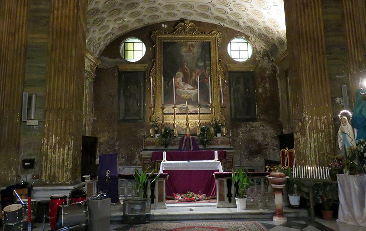 This section of Strada Papale is now called Via del Governo Vecchio after the palace by the same name. It was one of the most important streets of Rome and many buildings show the wealth of their owners. Palazzo dei Ritratti (portraits) is the name usually given to a palace decorated with reliefs portraying great jurists of the past and for this reason it is also known as Palazzo dei Giureconsulti. The reliefs were most likely made in the late XVIIth century at the initiative of Bartolomeo Lupardi, a bookseller who made a fortune by publishing librettos. Andrea Leone, his nephew, was a brilliant lawyer. The Lupardi eventually bequeathed the building to Arciconfraternita delle Stimmate di S. Francesco.