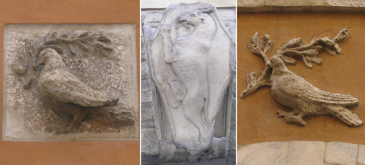 (left/right) Pamphilj doves in Via de' Granari and Via De Cupis; (centre) De Cupis heraldic symbol in Via di S. Maria dell'Anima