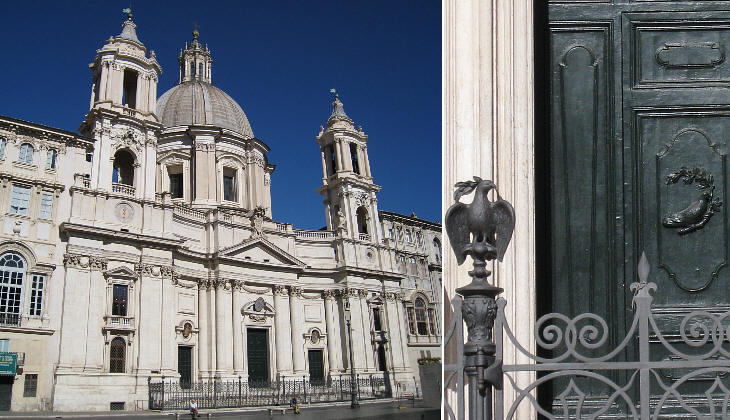 (left) Façade; (right) doves, the heraldic symbol of the Pamphilj