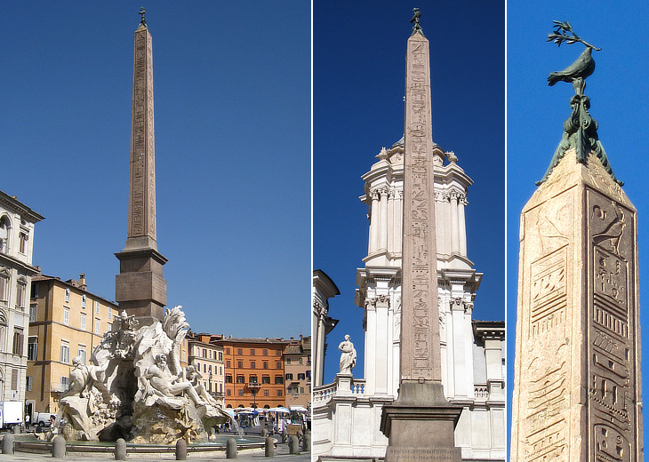 (left) Fontana dei Quattro Fiumi; (centre) the obelisk; (right) bronze dove at the top of the obelisk