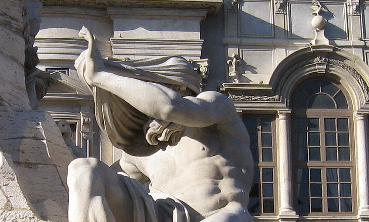 Rio de la Plata is awestruck by the New Faith which was unknown in its part of the world. Its gesture brings to mind a detail of Raphael's Transfiguration (it opens in another window) and a famous statue by Giambologna. Initially Bernini had designed a statue which was in line with the traditional iconography of America (see a model of the fountain showing a different Rio de la Plata).