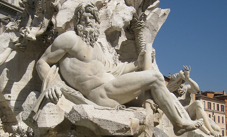 The statue of the River Ganges is the only one which is based on the ancient iconography of river gods and it resembles that of Marforio although Ganges is not as comfortably placed on the rock as Marforio.