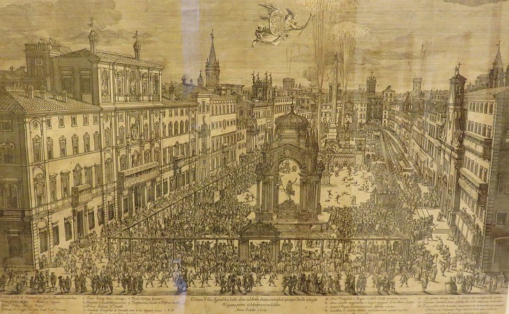 Museo di Roma a Palazzo Braschi: Dominique Barrière: Piazza Navona on Easter Sunday 1650 with ephemeral arches designed by Carlo Rainaldi. The new façade of S. Agnese in Agone was yet to be built