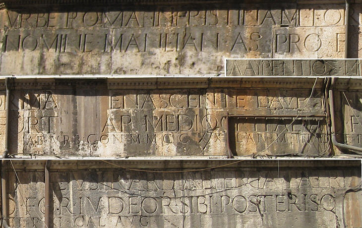 Vasi described the inscription on a group of houses as antica (ancient), but he should have called it modern because it dates back to 1468. The text was dictated by Lorenzo Manilio, the owner of the houses, to express his admiration for Ancient Rome: