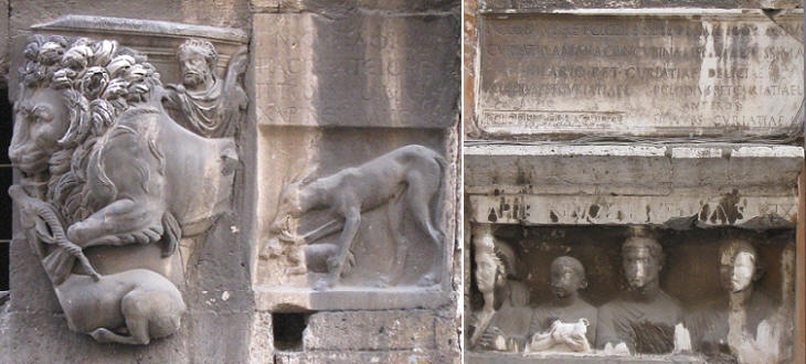 Ancient reliefs: (left to right) part of a sarcophagus, a Greek funerary monument, inscription (above) and funerary monument (below) from Via Appia