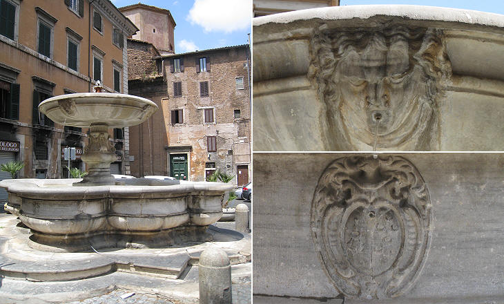 (left) Fountain; (right-above) detail of the upper basin; (right-below) coat of arms of Prospero Iacovacci