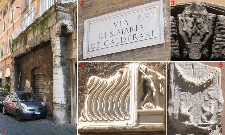 1) Ancient portico (see the nearby plaque indicating the level of the 1598 flood); 2) tablet with the name of the old church; 3) detail of a Renaissance portal in Via S. Maria dei Calderari; 4) relief of a sarcophagus portraying Hercules; 5) funerary monument