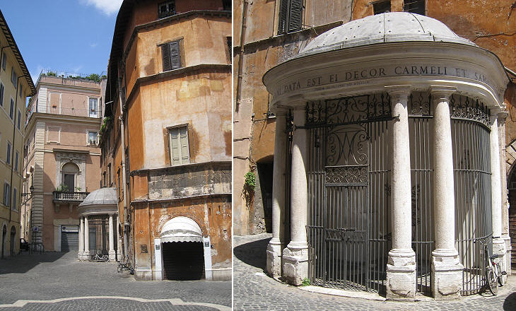 (left) The location of Tempietto del Carmelo between Casa di Lorenzo Manilio and the rear side of Palazzo Costaguti; (right) Tempietto del Carmelo