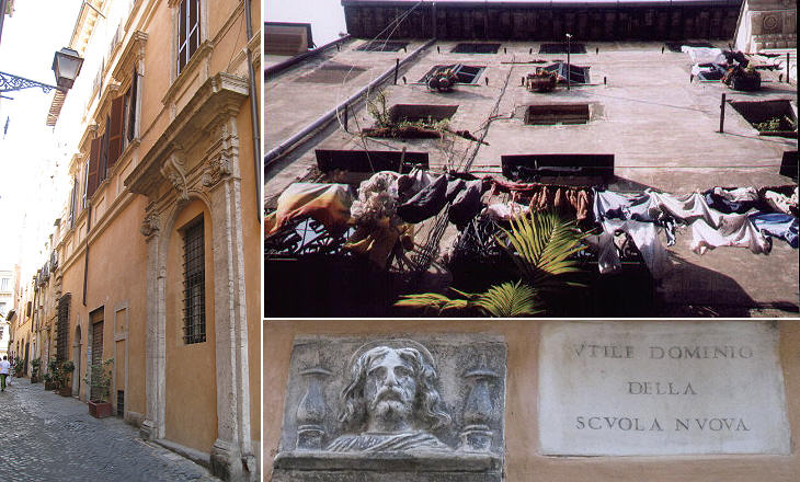 (left) Via della Reginella and the closed entrance of Palazzo Costaguti; (right-above) one of the tall houses built in Via Reginella; (right below) tablet indicating a house which belonged to Spedale del Salvatore (or di S. Giovanni) and which was acquired by one of the rabbinical schools