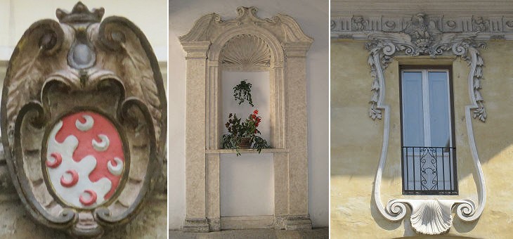 (left) Coat of arms of the Cenci; (centre) decoration of the entrance of a palace near Arco dei Cenci; (right) window with a baroque frame in another building belonging to the Cenci