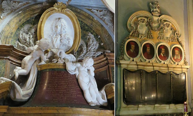 (left) Monument to Scipione Publicola Santacroce by Giovanni Battista Maini and Tommaso Righi (1750); (right) Monument to four Santacroce cardinals (late XVIIth century). See other monuments where the dead is portrayed in a medallion