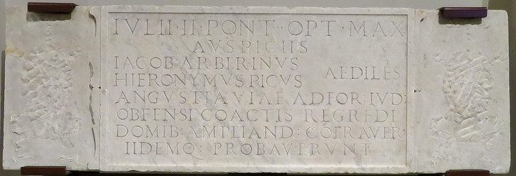Museo Ebraico di Roma: 1508 inscription celebrating the enlargement of the street leading to FOR(um) IUD(aeorum), the Jewish quarter, by the municipal authorities at the time of Pope Julius II
