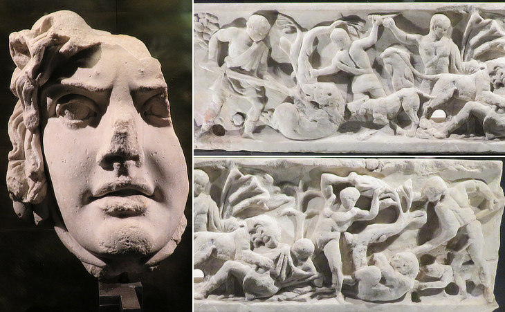 Ashmolean Museum of Oxford: marbles from Smyrna: (left) relief depicting collared slaves being conducted to fight against beasts (IInd century AD); (right) gravestone of a "retiarius" (Ist century AD)