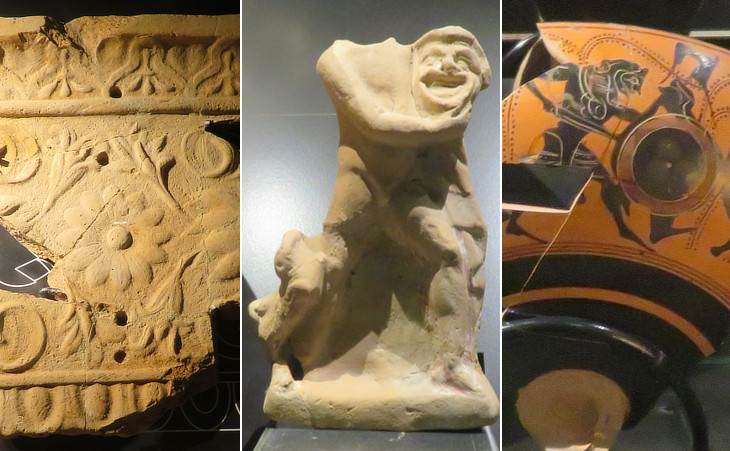 (left) Corinthian capital with a head of Gorgon from the upper loggia; (right) "tabula lusoria" gaming board (see similar ones on the Palatine and at Thamugadi in Algeria)