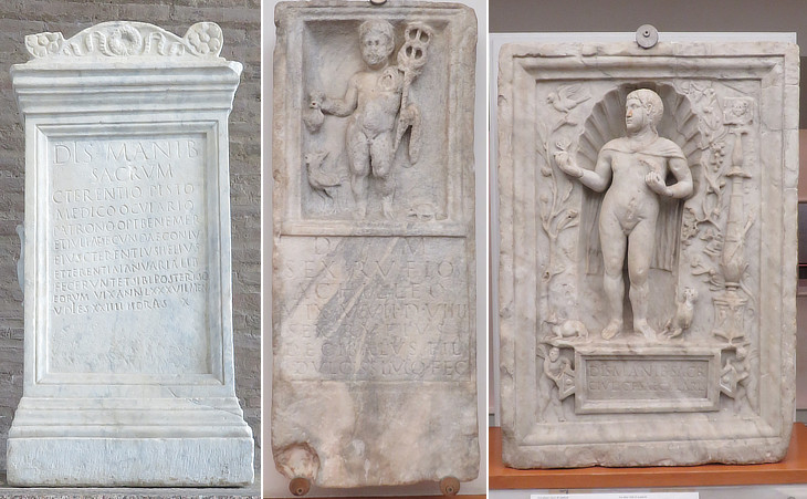 Museo Nazionale Romano alle Terme di Diocleziano: (left) ossuary altar of an oculist (medico oculario) who lived 87 years, 5 months, 24 days and 10 hours (Ist century AD - from Porta Maggiore); (centre) tombstone of Sextus Rufius Achilleus who died 7 months and 9 days old. He was depicted as Mercury the god who accompanied the dead to Hades. Also the rooster and the turtle at his feet are symbols of Mercury (IInd century AD from the Kircherian Museum - see other reliefs depicting the god); (right) altar with hollows to contain the ashes of Caius Iulius Saecularis. The inscription is held by two Cupids and it does not say more but the fine relief shows the dead in a sort of Garden of Eden, with animals and trees (Ist century AD from Tusculum)