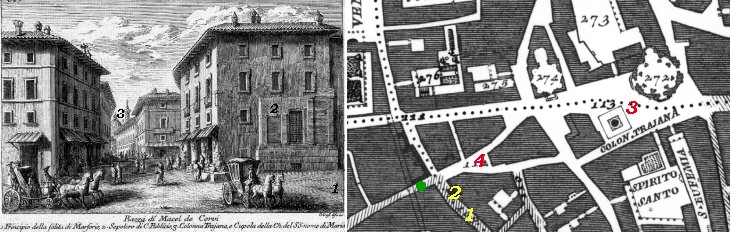 The view is taken from the green dot in the 1748 map here below. In the description below the plate Vasi made reference to: 1) Salita di Marforio. This street linked Piazza Venezia with the top of Campidoglio; Marforio, a talking statue, stood there until 1595 when it was moved to Piazza del Campidoglio; 2) Tomb of Caio Publicio Bibulo; 3) Colonna Trajana and Dome of SS. Nome di Maria.