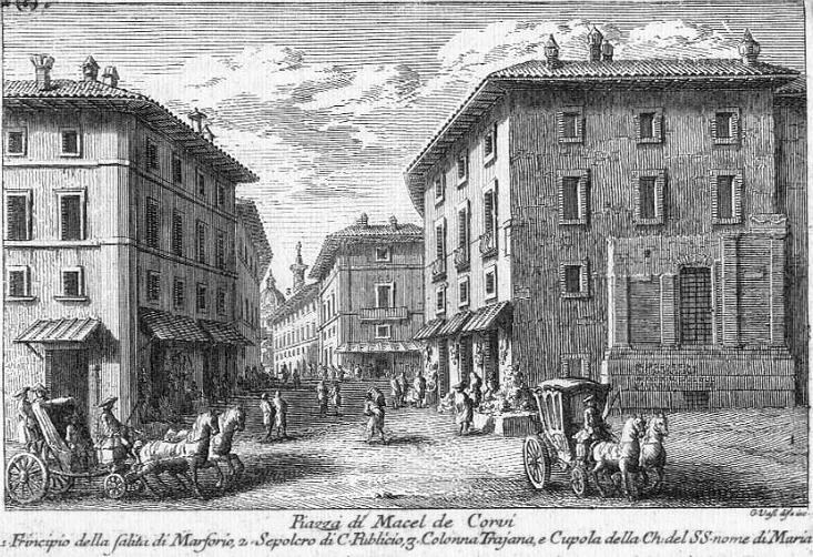 Macel de' CorviQuì sebbene non vi sia, che una piccolissima piazza, con tutto ciò evvi un abbondante mercato di tutte le sorte di viveri. E' notabile il sepolcro di Cajo Publicio, che si vede nell'angolo della salita, che dicesi di Marforio, con una antica iscrizione, che resta quasi perduta. |