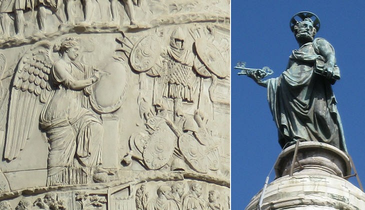 (left) A winged Victory writes the history of the Dacian Wars (it shows up in the image used as background for this page too - see a similar statue at Brescia and reliefs depicting military trophies at Orange); (right) bronze statue of St. Peter by Tommaso Della Porta and Leonardo Sormani (see it from a different point)