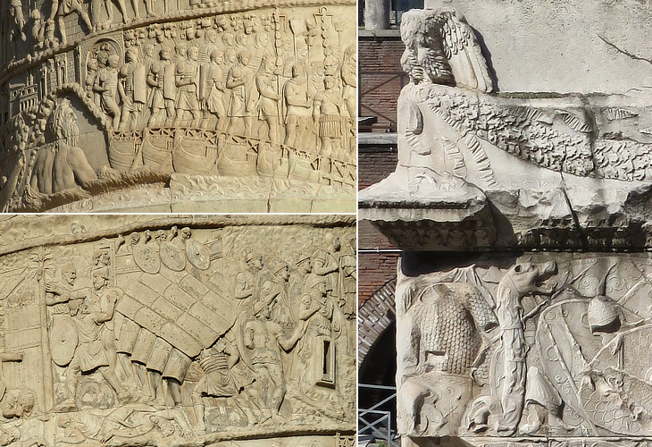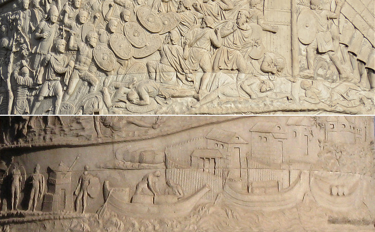 (left-above) The Roman army crosses the River Danube on a boat bridge; (left-below) the Romans attack a Dacian fortress in a testudo (turtle) formation;