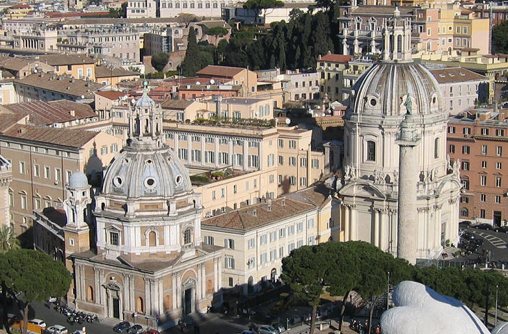 S. Maria di Loreto (left) and SS. Nome di Maria (right) seen from Terrazza delle Quadrighe at the top of Monumento a Vittorio Emanuele II (between them Palazzo Valentini and in the upper part of the image the trees of Giardino Colonnese). The stone pine in the lower left corner was pulled down in 2008 when excavations were made which led to unearthing "Auditoria Hadriani"