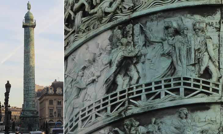 (left) Colonne Vendôme in Paris; (right) detail showing Napoleon Bonaparte leading his troops at the Battle of the Arcole Bridge (1796) near Verona