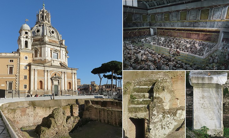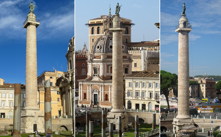 (left) The column seen from Basilica Ulpia; (centre) from Mercati di Traiano; (right) from Magnanapoli; the column and its reliefs were not meant to be seen from ground level, but from two tall buildings at its sides