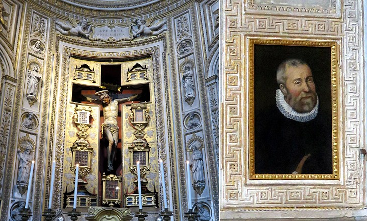 S. Maria di Loreto: (left) XVIth century wooden crucifix framed by an XVIIIth century bronze reliquary; (right) late XVIth century painting by Nicolò Circignani, better known as il Pomarancio, portraying one of the donors who contributed to the decoration of a chapel