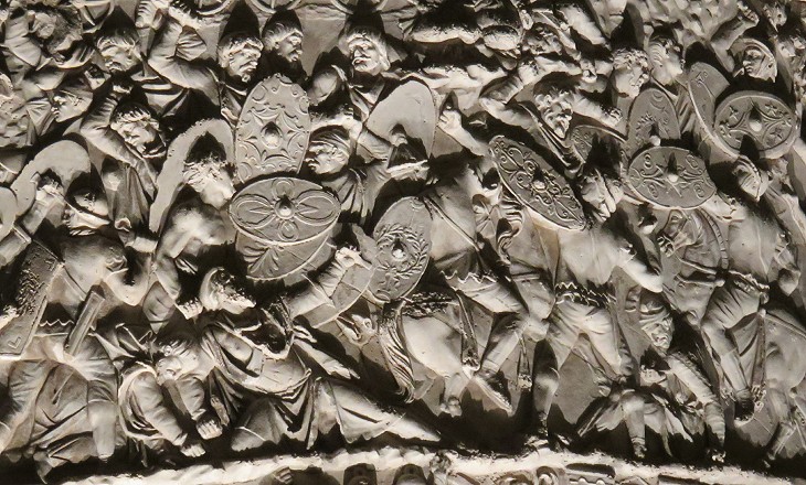A night view of a relief showing the subjugation of a Dacian tribe. The artificial light emphasizes the decoration of the shields