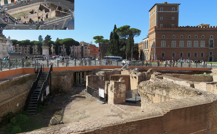 A view of the Auditoria Hadriani and Palazzo Venezia aka S. Marco in the background; (inset) view from Terrazza delle Quadrighe