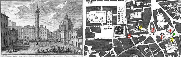 The view is taken from the steps of SS. Nome di Maria on the lower right corner of the etching (green dot in the 1748 map here below). In the description below the plate