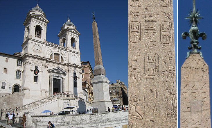 (left) Obelisco Sallustiano; (centre) detail of its hieroglyphics; (right) bronze heraldic symbols of Pope Pius VI
