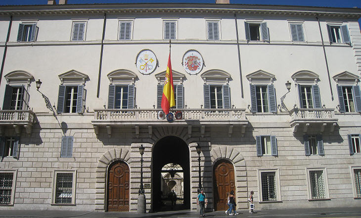 In 1622 a Spanish ambassador rented a small palace belonging to the Monaldeschi in Piazza della Trinità, the old name of Piazza di Spagna. In 1647, in consideration of the development which had occurred in the area, King Philip IV of Spain bought the building to use it as the permanent location of the Spanish Embassy. Today it houses the Spanish Embassy to the Holy See, while that to the Italian Republic is at Palazzo Borghese (you may wish to see the Spanish Ambassador to the Holy See in high uniform).