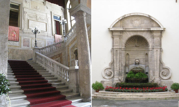 (left) Staircase designed by Antonio Del Grande; (right) fountain in the courtyard. You may wish to see more fountains in the courtyards of Rome