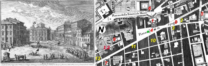The small map shows also 6) SS. Trinità dei Monti; 7) S. Atanasio dei Greci (along Via del Babuino);