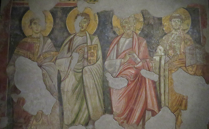 Detached XIth century fresco from the walls of the old basilica portraying four saints; the last two are St. Andrew (in a red garment) and St. Lawrence (in a golden one)