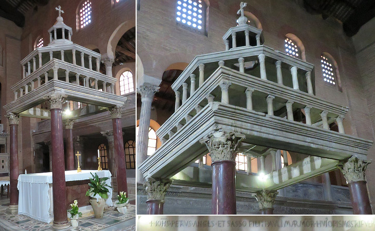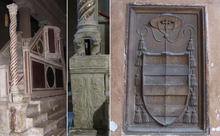 (left) Easter candelabrum (see a very similar one at SS. Cosma e Damiano) and right ambo (pulpit); (centre) upside down Roman altar with a decorative motif based on birds at the sides of a tree (see similar altars at Musei Capitolini and Villa dei Volusii); (right) coat of arms of Cardinal Oliviero Carafa (in the portico), who promoted a general restoration of the church