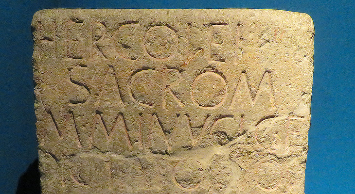 Temporary exhibition at Musei Capitolini: base of altar with dedication to Hercules (217 BC)