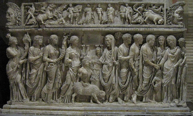 (above) Sarcophagus with two scenes of a pagan religious procession: the woman portrayed on a throne carried by lions is perhaps Cybele, a goddess of Asia Minor who was worshipped in Rome as "Magna Mater"; (below) Christian sarcophagus of Licinius Honorius "vir clarissimus" (lit. very famous man), a member of an important family, usually the son of a senator. He died in 366 and he was portrayed (centre) in the act of praying; the two men at the sides of the inscription could be St. Peter and St. Paul. The sarcophagus testifies to the spreading of Christianity in the Roman upper classes before it became the state religion of the Empire. It testifies also to the decline of Rome both because it is poorly decorated and because the age of Licinius is stated as "Vixit Anni Plus Minus LX" (he lived more or less sixty years) whereas the Romans were always very precise in indicating the age of the dead (see a Ist century AD inscription reporting even the hours)