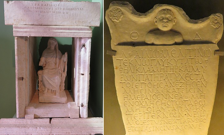 (left) Centrale Montemartini: altar/temple to Terra Mater (Mother Earth) found near the Verano cemetery; (right) Musei Capitolini: gravestone of Lucius Aelius Melitinos found near the Verano cemetery