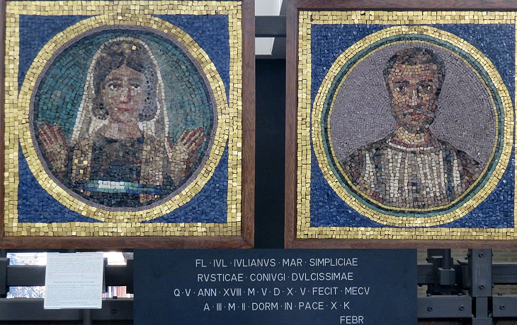 These two mosaics were found during the pontificate of Pope Alexander VII and in line with the practice of the time they were largely restored. The inscription is lost, but it was recorded. The mosaics were commissioned by Flavius Iulius Iulianus after the death of his young wife at the age of eighteen and after a marriage which lasted three years. Because of the location where they were found and because of the wife being portrayed while praying they are regarded as early Christian mosaics (see a fresco from Catacombe di S. Callisto).