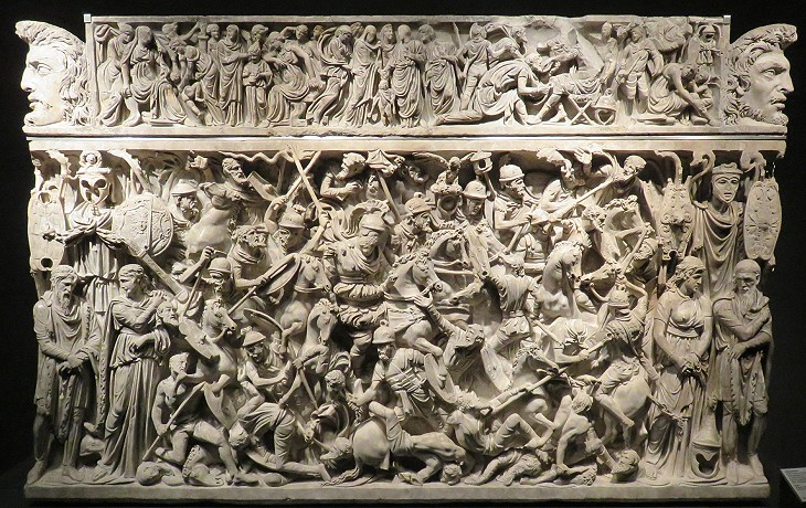 The face of the Roman commander at the centre of the scene was not finished and the sarcophagus does not bear an inscription. According to archaeologists it was not made to order, but it was produced to be offered on sale to a commander who had taken part in Marcus Aurelius' campaigns (you may wish to see another unfinished and unsold sarcophagus). The sarcophagus has some similarities with Sarcofago Grande Ludovisi, another large sarcophagus depicting a fight between Romans and barbarians, which was found near Porta San Lorenzo, not very far from Portonaccio.