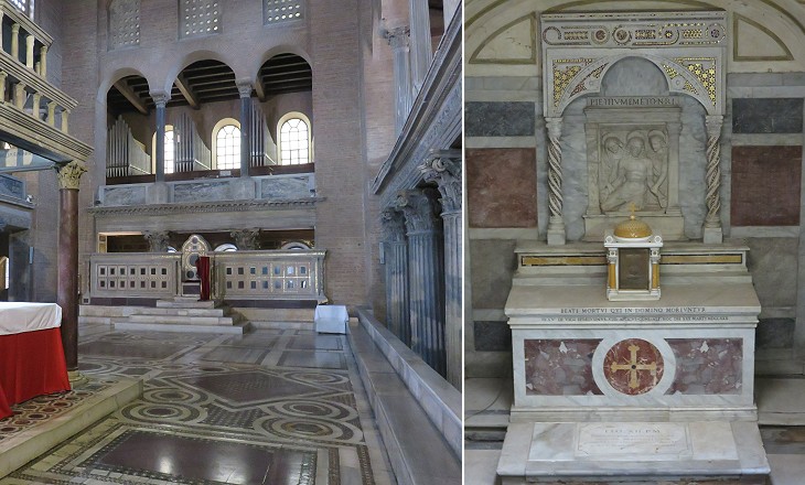 A flight of steps leads to the sanctuary paved with mosaic and adorned by a double story, each of twelve pillars of rich marble and Corinthian form. Of the lower range of pillars part only appears above, as it descends through an open space left for that purpose, far below the pavement. Four other columns adorn the wall that runs some feet behind the sanctuary, as four more of porphyry support the canopy over the altar. The seats of the sanctuary are of marble as is the chair of the pontiff, a very ancient episcopal throne. Eustace