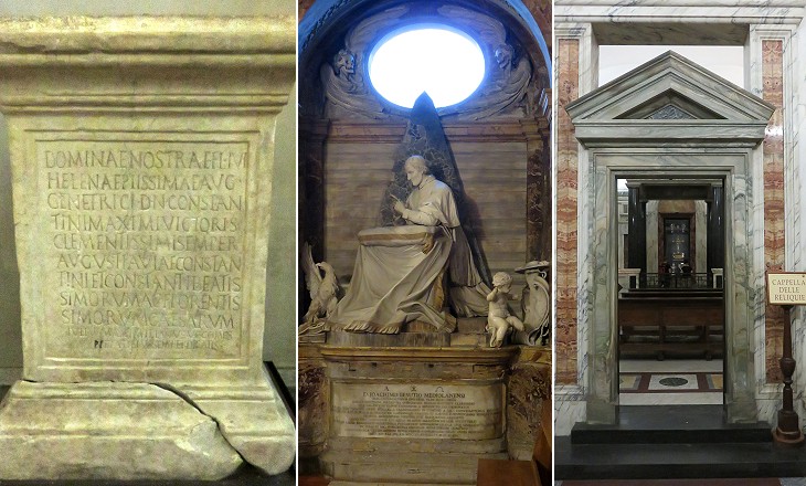 (left) Cappella Gregoriana, a chapel adjoining Cappella di S. Elena: pedestal of a statue of St. Helena (it was found at the time of Pope Sixtus V and based on the text of the inscription it is dated 326); (centre) 1755 monument to Cardinal Gioacchino Besozzi by Innocenzo Spinazzi (see a page on similar monuments); (right) entrance to Cappella delle Reliquie