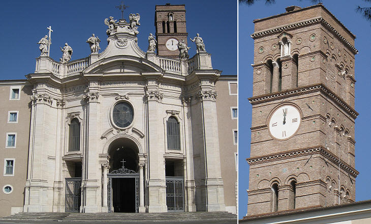 We may now follow the lines of white mulberry-trees across the open space in front of St. John Lateran to Sta. Croce. The sister basilicas look at each other, and at Sta. Maria Maggiore, down avenues of trees. On the left are the walls of Rome. (..) But the exterior of the church is disappointing and inappropriate, retaining nothing antique except the square Lombardic tower of the twelfth century, in storeys of narrow-arched windows, its brickwork ornamented with disks of coloured marble, and a canopy, with columns, near the summit, for a statue no longer in its place. Augustus J. C. Hare - Walks in Rome - 1873
